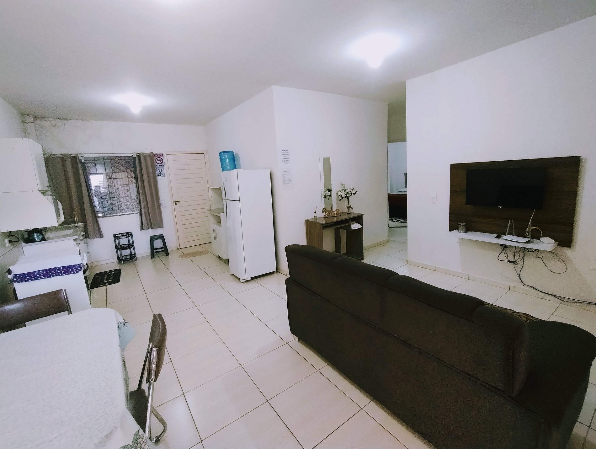 Very spacious apartment, with TV room, dining room and kitchen, being all the open concept space giving greater convenience to guests, a bathroom and three bedrooms being equipped with 2 double beds and 2 single beds and single mattresses as needed and check values. Laundry with tank and space with a barbecue. Parking for 2 cars with electronic gate.